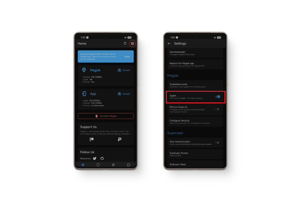 13. Open Magisk and check to see if Zygisk is still enabled. Now, once root is hidden from selected apps, the Magisk app itself needs to be hidden.