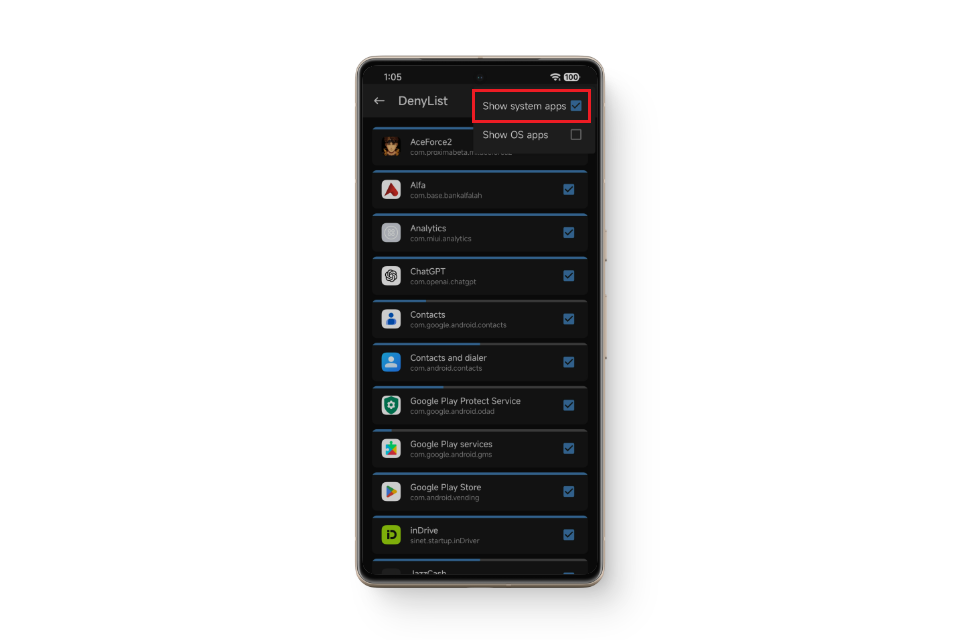 11. This will open a list of all apps installed on your phone. The selected apps in the list will be used as a reference to hide root from them.