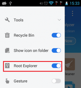 - Launch ES File Explorer, tap on the action menu and make sure Root Explorer is enabled.