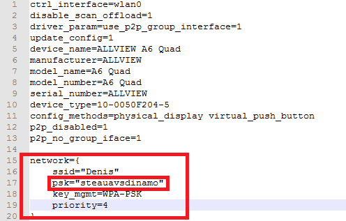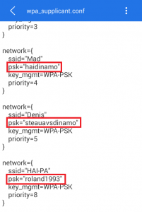 - You should be able to see a list with all the networks your Android device was connected until now. The password for each Wi-Fi name (ssid) is located after “psk”.
