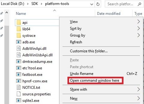 - Shift + Right Click anywhere inside the platform-tools folder and click on Open command window here.
