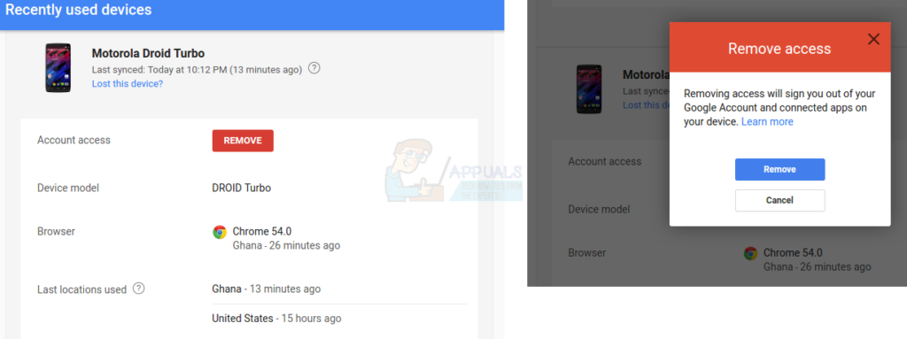 - Click on Remove Access under the device you wish to remove and then Remove again when the confirmation dialog pops up. Removing access will sign the targeted device as well as connected apps out of your Google account.