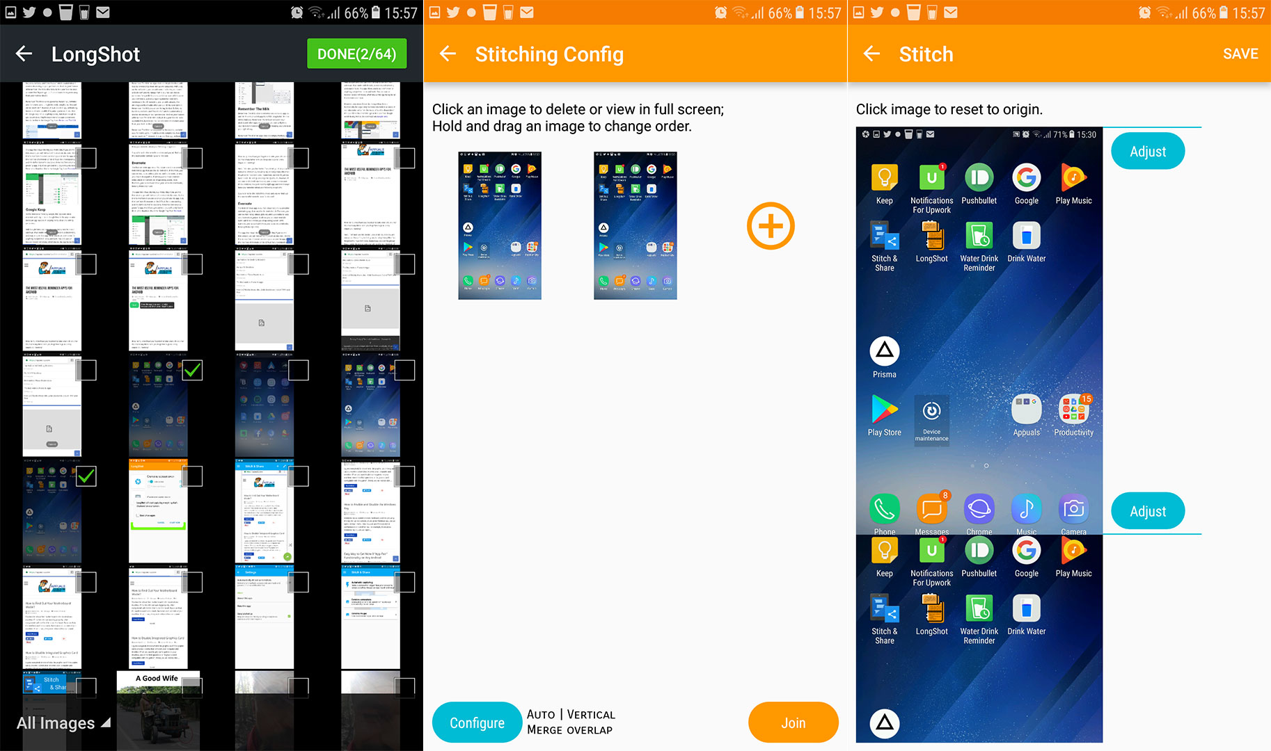 Next, you need to click the “Join” button, and the app will automatically stitch the screenshots into one image. However, if you want to change the stitching points manually, you can do it as well by taping on the “Adjust” button.