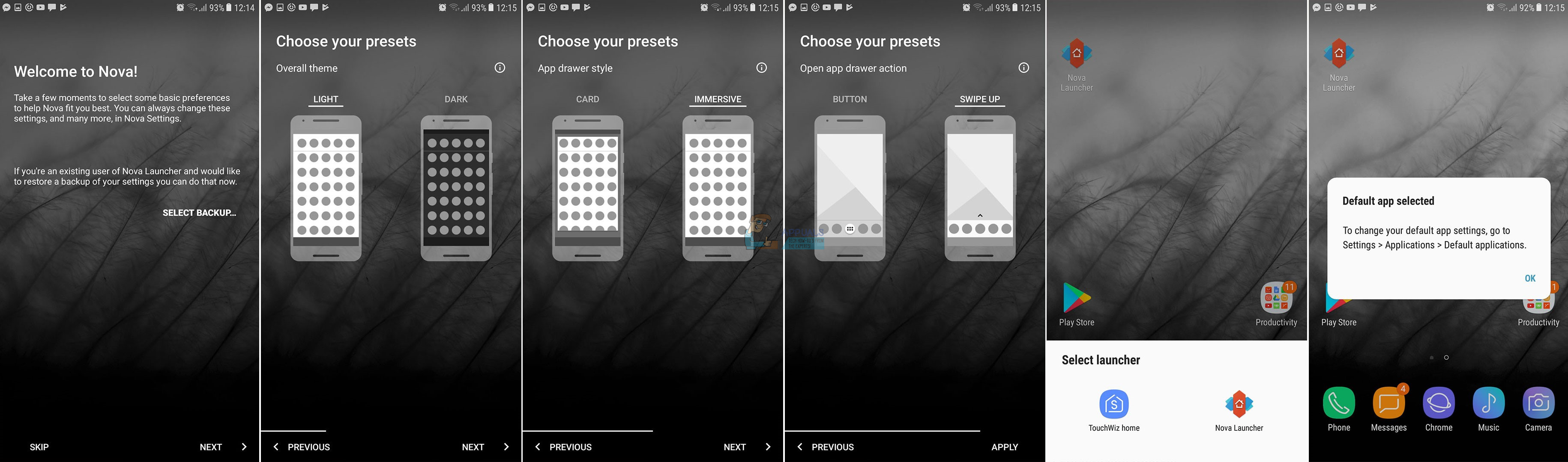 Setting up the Nova Launcher is simple, and it requires just a few steps. You just select the layout you like and click Next. Here you can choose if you like light or dark overall theme, card or immersive drawer style, and button or swipe up drawer action. After you finished the process, hit the home button and choose Nova Launcher as your default launcher.