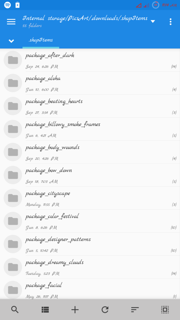 2. Now open a file explorer on your device, and navigate to where PicsArt has been installing resource packs on your device. It should typically be /Internal storage/PicsArt/.downloads/.shopItems