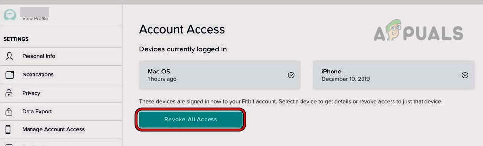 3. Navigate to Settings > Manage Account Access and select Revoke All Access. Revoke Account Access of Fitbit