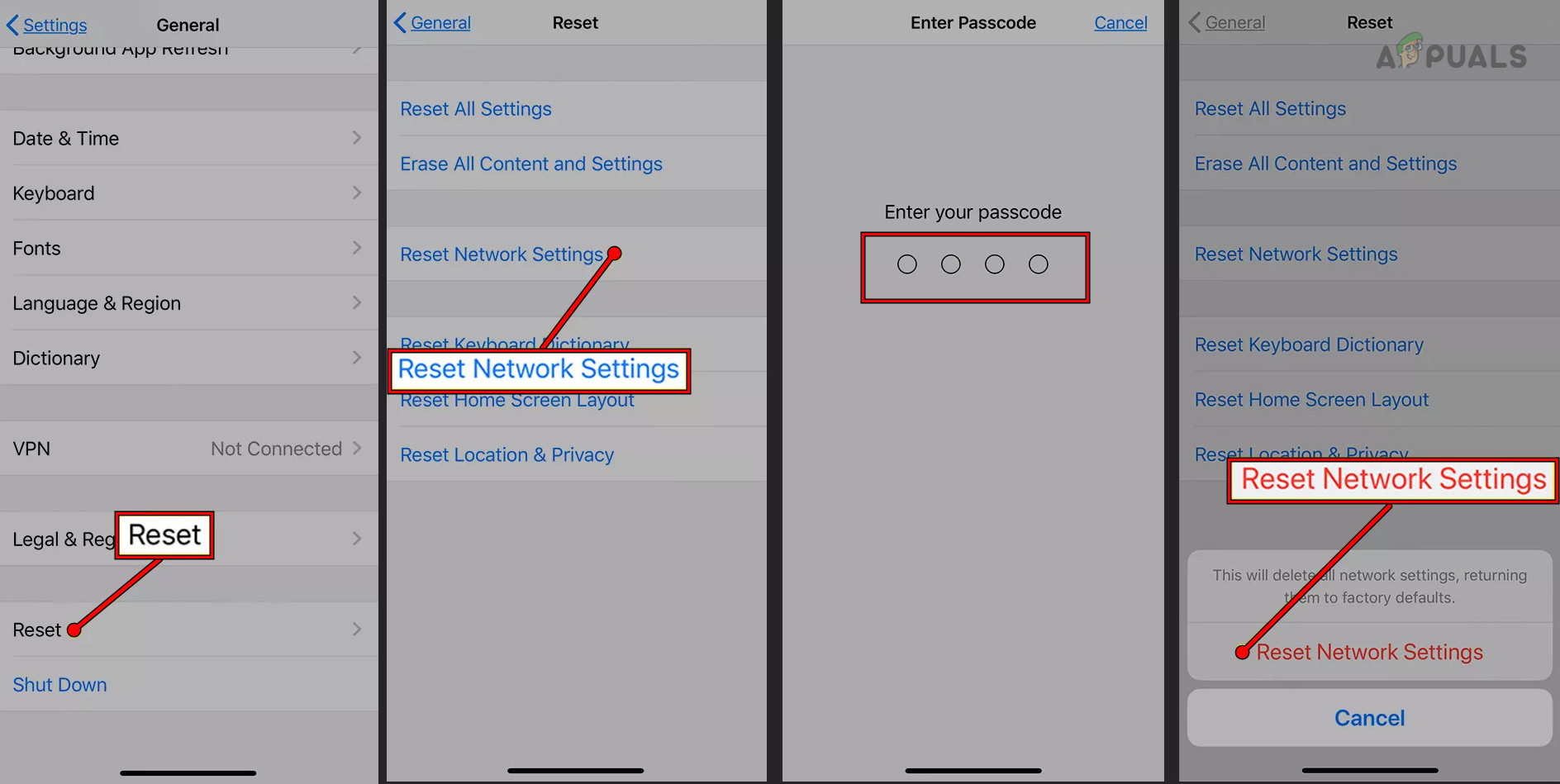 1. Go to the iPhone Settings > General > Reset > Reset Network Settings. Reset the Network Settings of the iOS Device