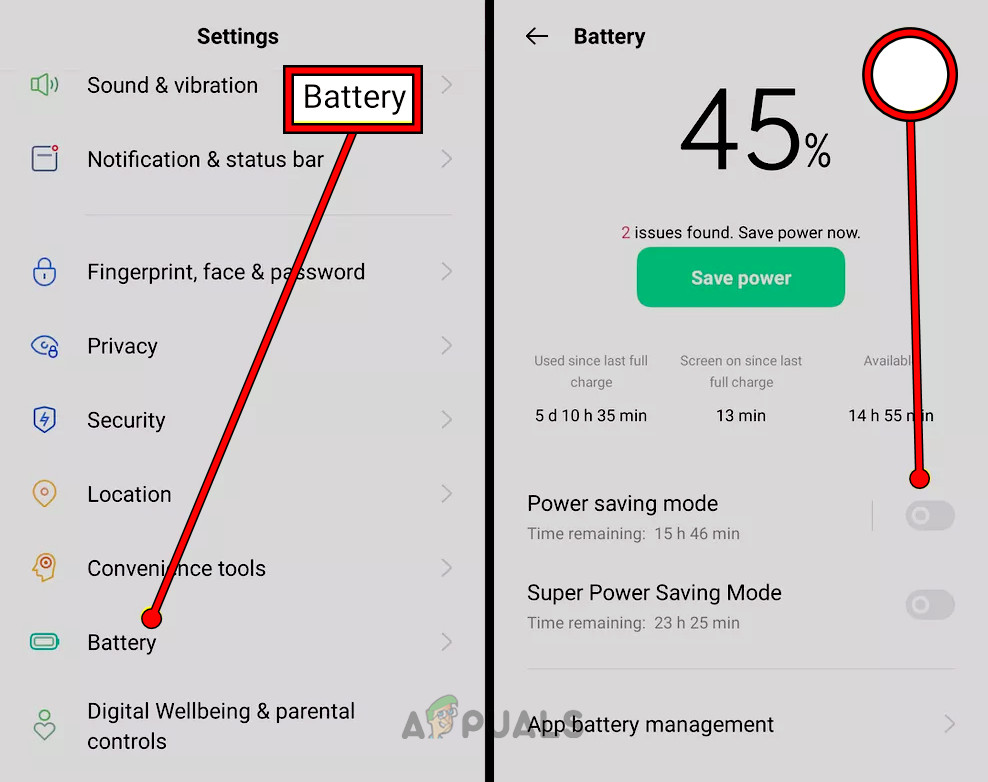 1. Access the phone’s Settings and go to the Battery section. Disable the Power Saving Mode in the Android Phone Settings