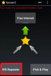 Ignore the “Free Internet” button, this was originally developed as a method of sharing proxied, non-restricted internet to other devices in China, like an uncensored wifi hotspot. You want to enable your WiFi connection on your Android device and press the “WiFi Repeater” button.