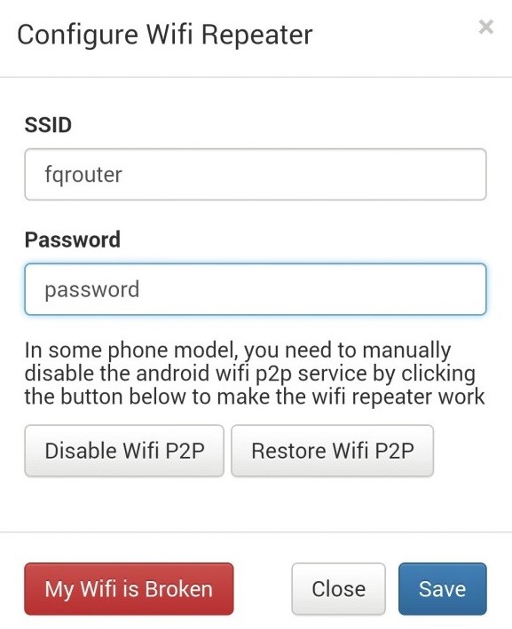 Now you want to go into FQRouter2 Settings, and tap “Configure”. This will allow you to set up the SSID/password of the wifi network, similar to Mobile Hotspot. Warning: Do NOT press the “My Wifi is Broken” button. This will delete all of the saved networks and passwords on your device. In any case, after configuring the FQRouter2 hotspot, you should be able to connect with another device.