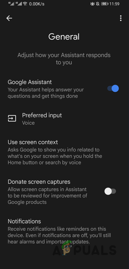 9. Finally, once you are in the General settings, tap on the slider provided next to Google Assistant to turn it off. Turning off Google Assistant