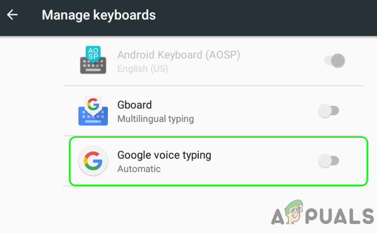 Disable Google Voice Typing in Manage Keyboards - Afterward, check if Google Voice Typing is turned off.