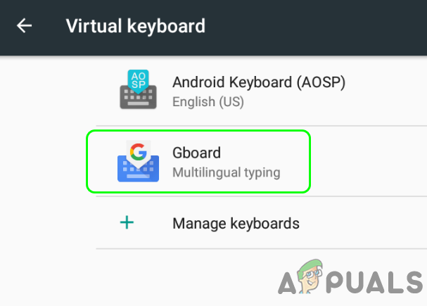 - Now select Gboard (or the 3rd party keyboard application). In some cases, you may have to select Virtual Keyboard before tapping on Gboard.