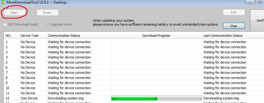 - Click the Start button and wait for a bit until you see green text. Now disconnect your phone and boot into the Android system!