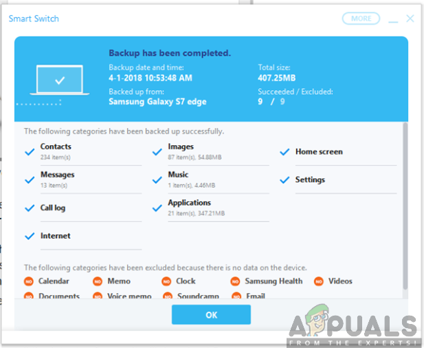1. After the backup process is complete, you will be able to see a summary of the data that was backed up. Now, click on OK.