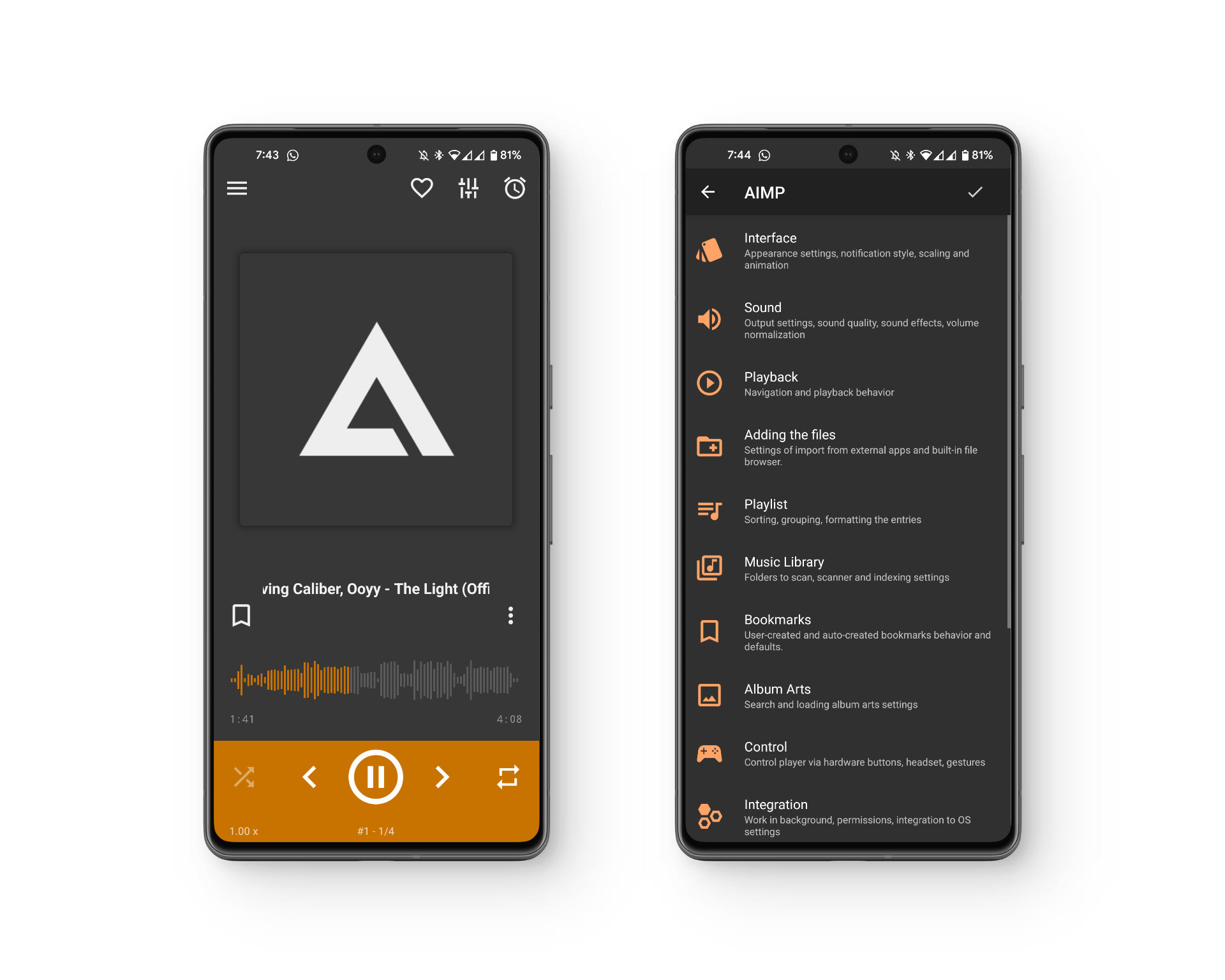 AIMP is great for playing tracks stored in folders, offering quick access to playlists through the hamburger menu and featuring a 29-band equalizer. Users can switch between “mono” and “stereo” outputs, adjust crossfade times between tracks, and enjoy online radio for variety. Overall, AIMP is a simple app perfect for distraction-free local music playback.