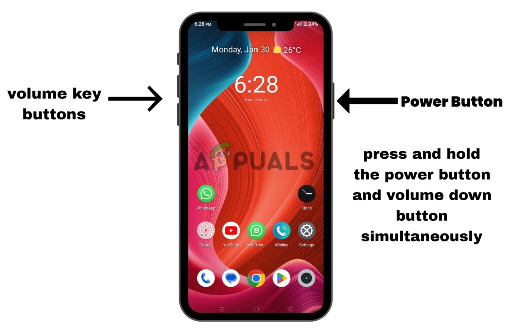 - Press and hold the Power button and Volume Down button at the same time.
