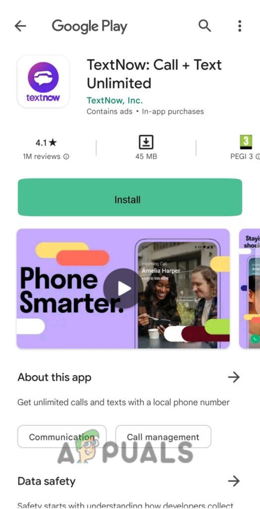 Click on Install to download the TextNow app