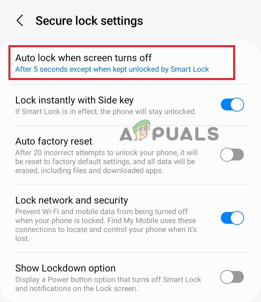 If disabling Adaptive Brightness and changing the Screen Timeout hasn’t worked, try adjusting your Secure Lock settings. This allows you to decide how long your device stays unlocked after the screen turns off.