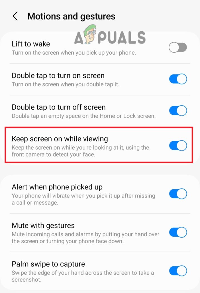 Select Motions and gestures - Turn on the toggle next to Keep screen on while viewing.
