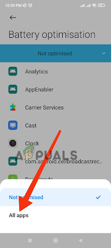 - Now, it will only open the apps that are not optimized. Tap on the drop-down menu and select All Apps.