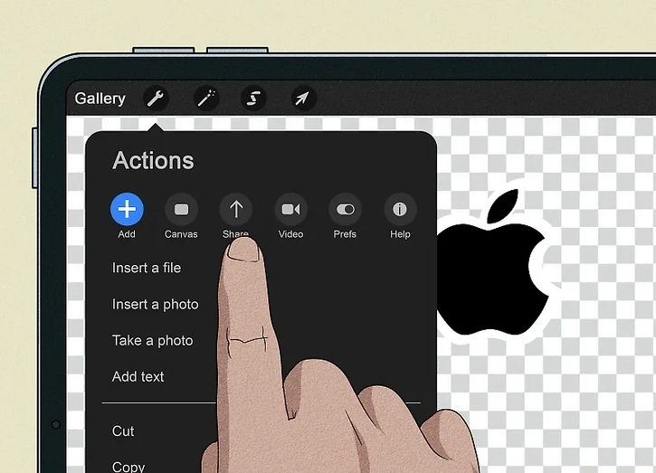 Once you’re satisfied with your design, tap the wrench icon to open the Actions menu. Choose “Share” and select PNG as your file format. Pick a location on your iPad to save the file, and your sticker design will be ready to print or share.